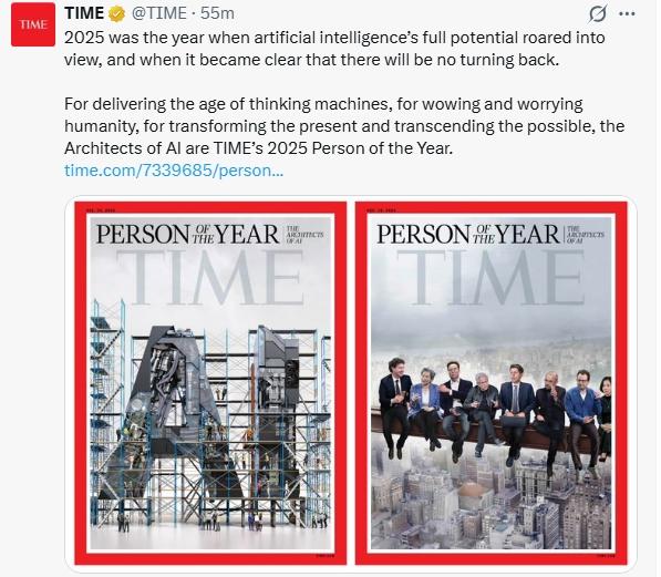 本地时间11日,让全人类惊讶亦忧愁、改变当下并冲破可能性的边界,”《时代》周刊正在社交上称,《时代》周刊暗示,2025年是人工智能潜力全面迸发且无可回头的一年。‘AI的缔制者们’被选为《时代》2025年年度人物。“人工智能(AI)缔制者们”被美国《时代》周刊评为2025年年度人物。