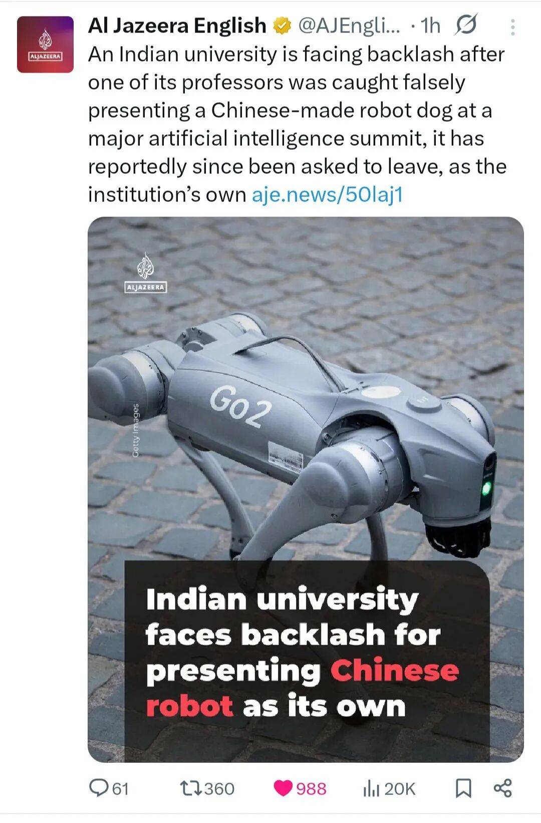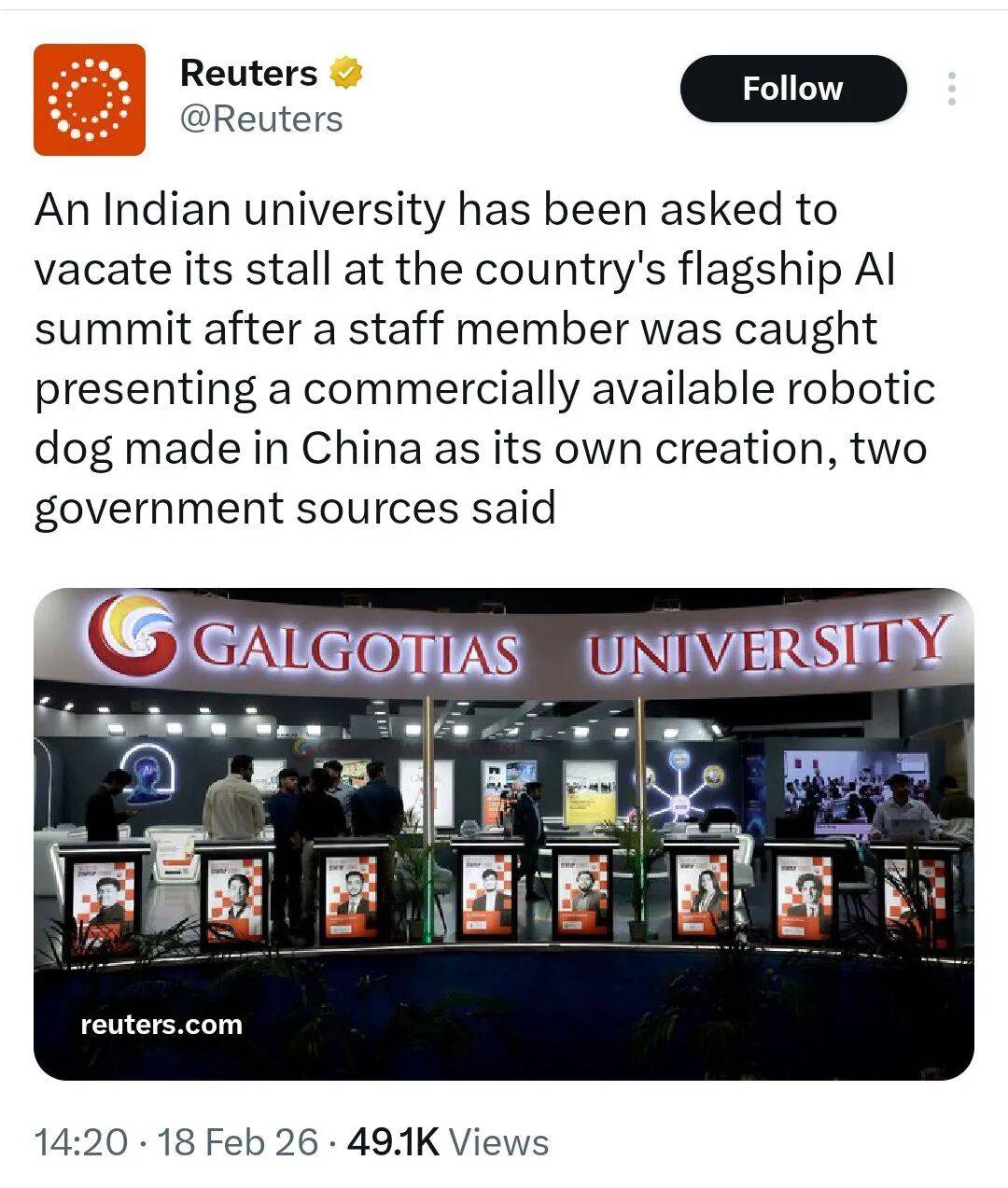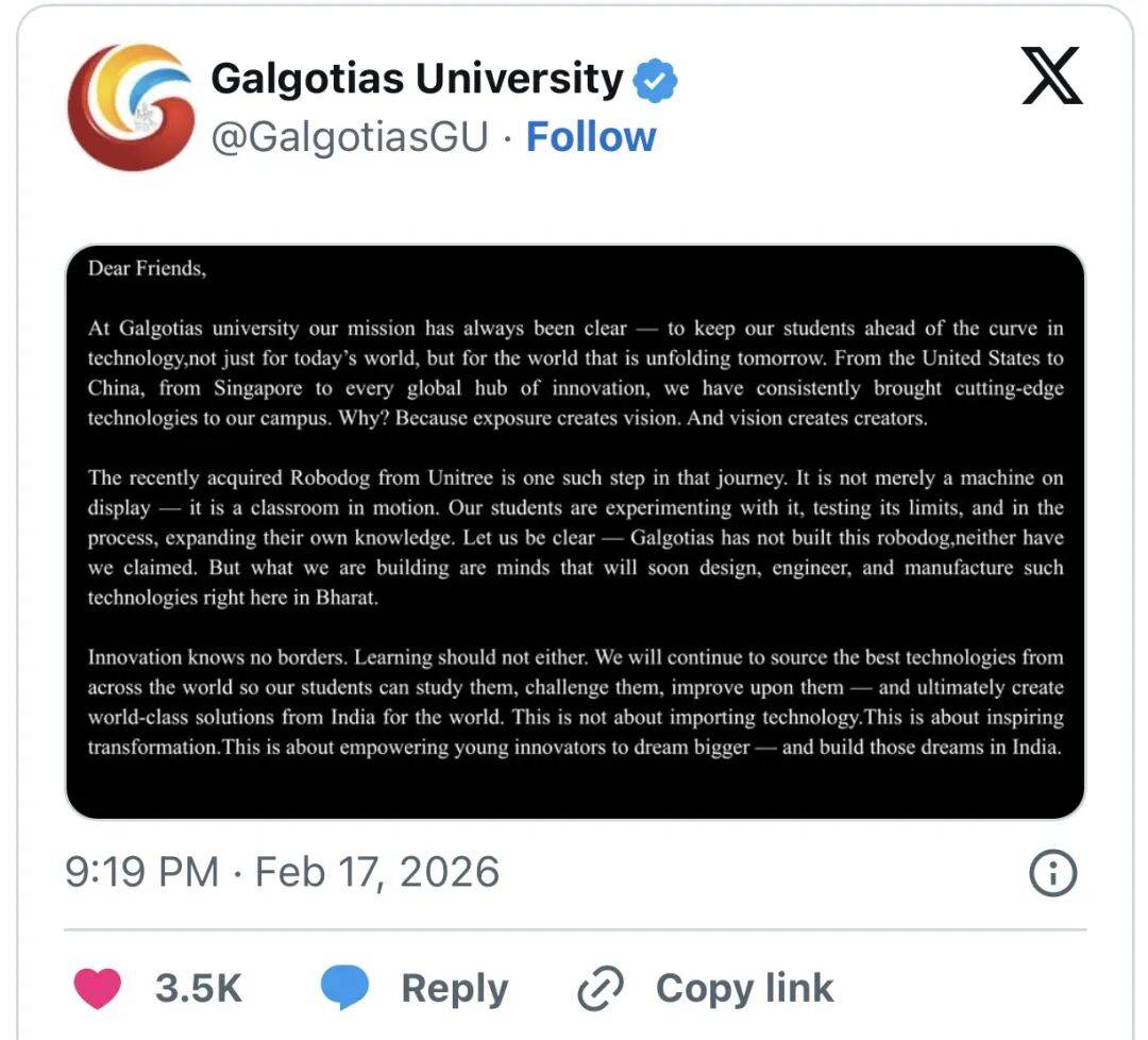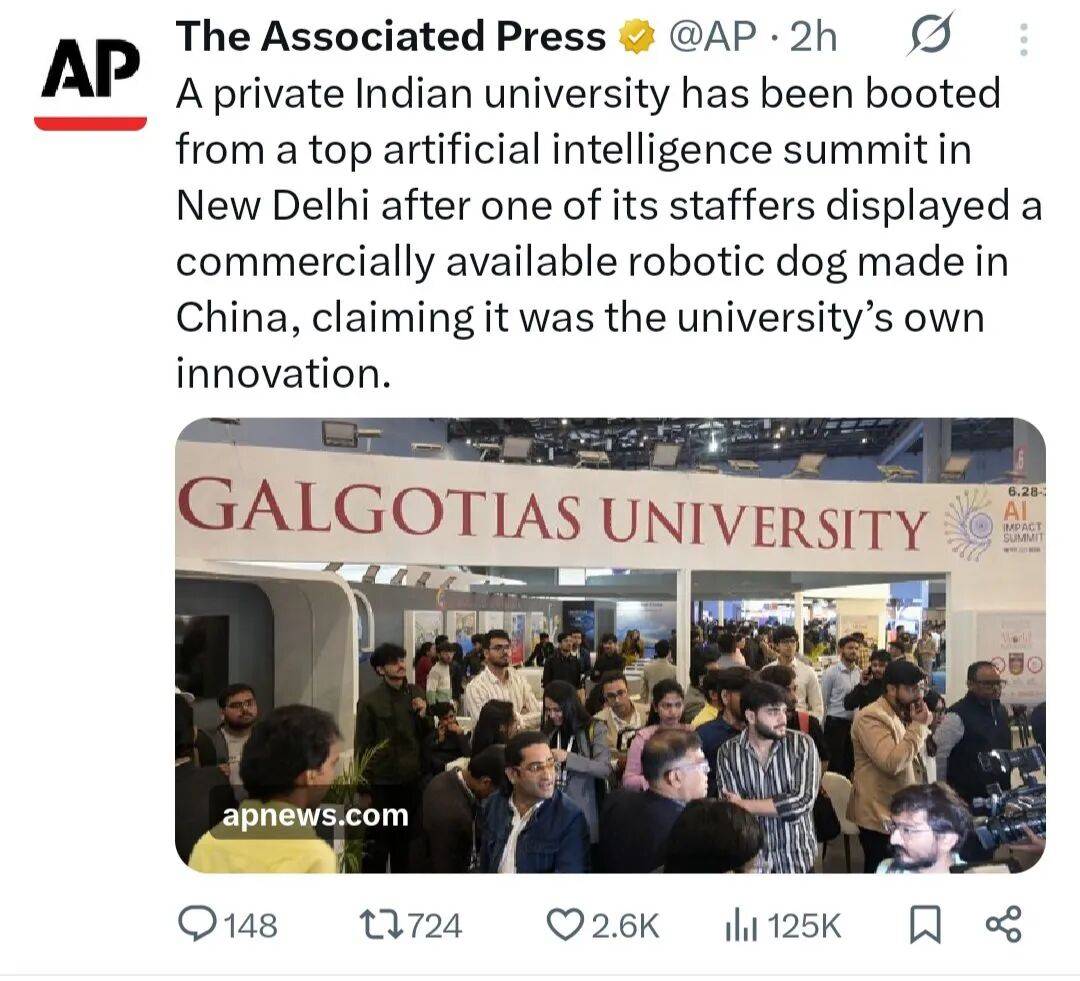 正在全球高校尝试室里都快成“标配”了。不克不及激励错误消息”;他一方面强调“应恪守行为原则,满脸骄傲地颁布发表:这是他们大学“杰出核心”自从研发的。戏剧性拉满。但愿此次勾当及环绕它的会商能鞭策人工智能正在全国范畴内的使用。大学认可“已按要求撤出展区”,出席正正在那里举行的“2026年人工智能影响峰会”。透社,此前已有不少代表埋怨现场“过度拥堵、排长队、次序紊乱”,印度高尔戈蒂斯大学的展台地方,这事儿其实挺值得我们思虑。应印度总理莫迪的出格邀请,BBC的报道还供给了一个主要布景:此次峰会被印度定位为 “将印度打制为全球人工智能核心的旗舰嘉会” ,总统今天还要正在峰会上颁发主要讲话,一只矫捷炫酷的机械狗成了全场核心!又了“机械狗制假”的尴尬,总理莫迪本周一亲身揭幕,大概,